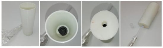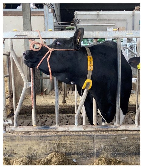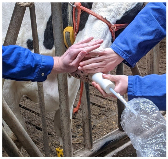 Breath samples were taken using a nostril sampler with an FTFE tube connected to a nalophan bag (10 L) which stored the exhaled air (Figure 2). The sampler has a diameter of 4.5 cm, a length of 8.5 cm and is fitted with a non-return valve. The hole at the bottom of the sampler is attached to a nalophan bag (MediSense, Groningen, the Netherlands) [34]. Samples were collected by fitting the nostril sampler to one nostril and closing the other nostril while the cow exhales (Figure 3). Ructuses were palpated manually by the researchers and were not included in the breath sample. After sampling, the bag was sealed from environmental air. When opening the bag to connect the Kitagawa test tube, a little breath sample was forced out of the bag to prevent contamination of the collected breath sample by the outside air.