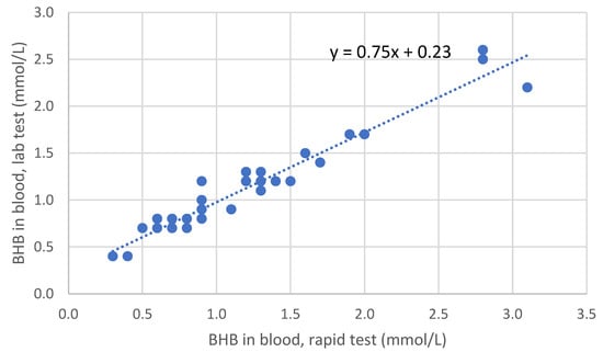 Results from the rapid test and the lab test for blood BHB were highly related, with a Pearson correlation of 0.971 (p < 0.001, Figure 5), with the results from the rapid test being slightly higher than from the lab test (B = 0.75). In this study, we used results from the lab tests as the gold standard for BHB in blood.