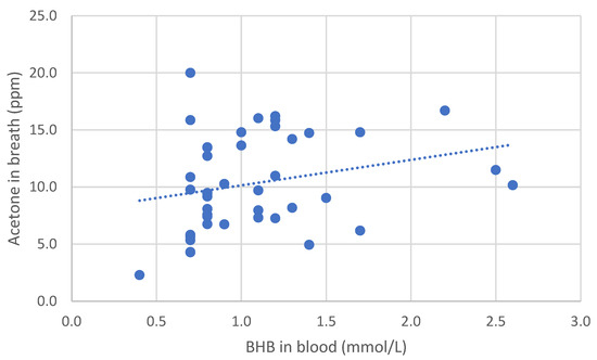 The concentration of acetone in breath samples and the corresponding BHB concentrations in blood are shown in Figure 6. The rise in breath acetone concentration was related to a rise in blood BHB on the same day (p = 0.047) and to a rise in blood BHB of the day before (p = 0.010). This suggests that a rise in ketone bodies in breath follows a rise in ketone bodies in blood. No relation was found between acetone in breath and blood BHB of the day after (p = 0.06). This means that a rise in acetone does not precede a rise in blood BHB.