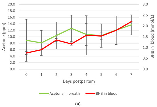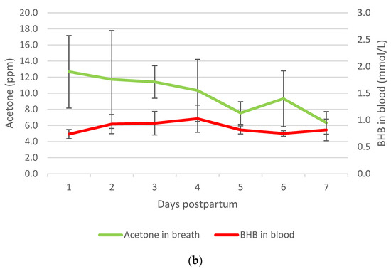 (a) Acetone concentrations in breath and BHB concentrations in blood (±SD) for four ketotic cows, daily samples until seven days postpartum. (b). Acetone concentrations in breath and BHB concentrations in blood (±SD) for three non-ketotic cows, daily samples until seven days postpartum.