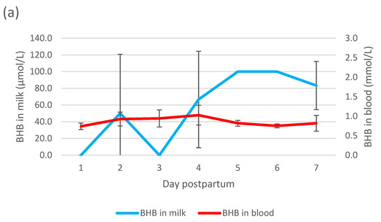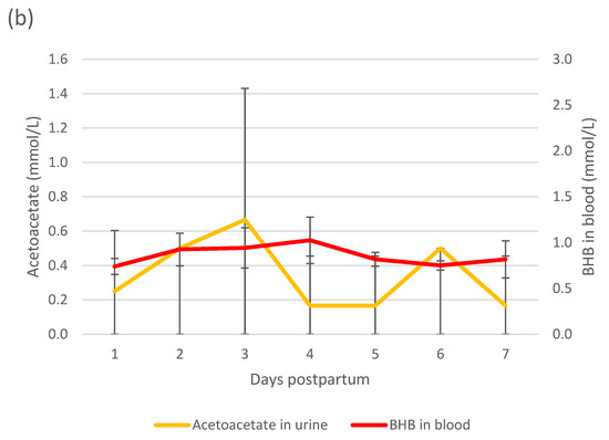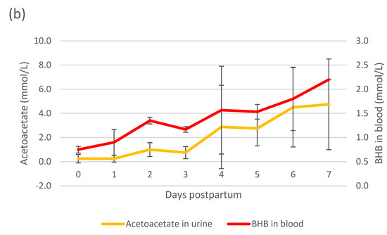Concentration of BHB in blood and BHB in milk (a) and acetoacetate in urine (b) (±SD) for three non-ketotic cows, daily samples until seven days postpartum.