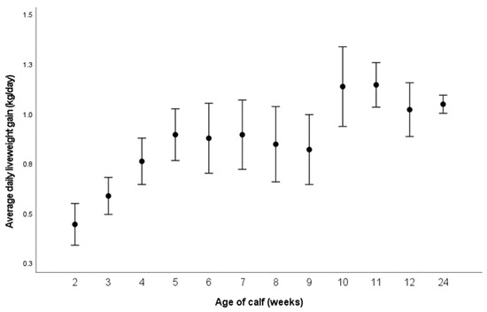 Mean ADLG of the calves calculated on a weekly basis (n = 32 calves), with 95% confidence intervals. The ADLG increased steadily over the first month of life, appeared to become more stable once calves were fed via the AMF and then increased again post weaning.