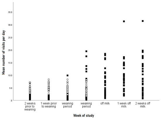 The overall mean number of refusal visits to the AMF was 4.9 (range of 0–46), and these increased over the weaning period even though a gradual step-down weaning program was used, which is in line with other studies [60,68,69]. Although solid feed intakes were not measured, the ADLG was maintained and even increased over the weaning period, suggesting that calves were likely to be transitioning well onto a solid feed diet, so hunger should not have influenced AMF visits. Others have suggested frustration as an explanation for unrewarded refusal visits during and following weaning [60], with the removal of near-ad libitum access to milk resulting in a lack of expected milk rewards when a calf visits the AMF. There may also have been an impact on the difference in weaning schedule between group members, with some calves still eligible to receive milk, which may have encouraged fully weaned calves to visit the AMF as they observed other calves feeding.