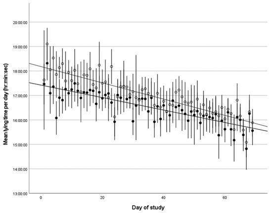 Mean lying time per day over the study period with 95% confidence intervals is shown (n = 30 calves). Females are denoted by black circles and males by white circles. As the calves got older, their lying times reduced (r2 = 0.66 for females, r2 = 076 for males).