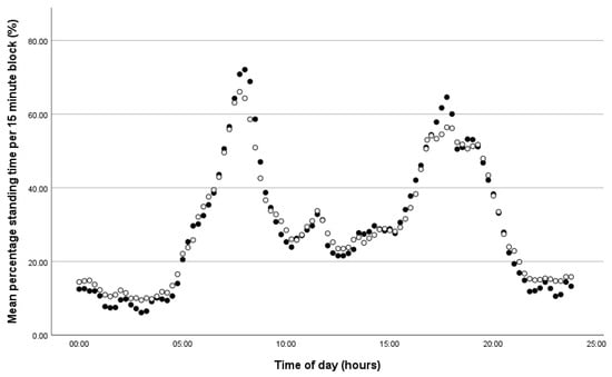 Accelerometers attached to the rear legs of calves (n = 30 calves) measured standing time in 15 min intervals throughout the day. These data were averaged across the study period from 1 to 12 weeks of age. The graph illustrates the mean percentage of time within each 15 min block that the calves spent standing (this includes both moving and stationary) over the course of the average day. White circles represent healthy calves (n = 19) and black circles represent calves who experienced disease (n = 11).