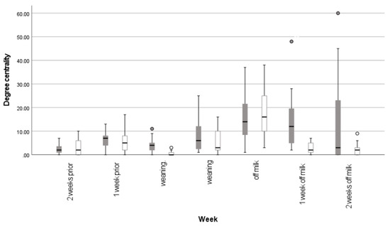 Distribution of the degree centrality for calves near the AMF by week of observation. Dark bars indicate calves in G 1 (n = 19 calves) and white bars indicate calves in G2 (n = 13 calves). The box and whisker plots show the median degree centrality for the calves in each group, the upper and lower quartiles for degree centrality and the upper and lower extremes, as well as any outliers (grey outlier circles are for G1, white outlier circles are for G2). It demonstrates that the degree centrality becomes more widely distributed during and after the weaning period, especially for calves in Group 1.