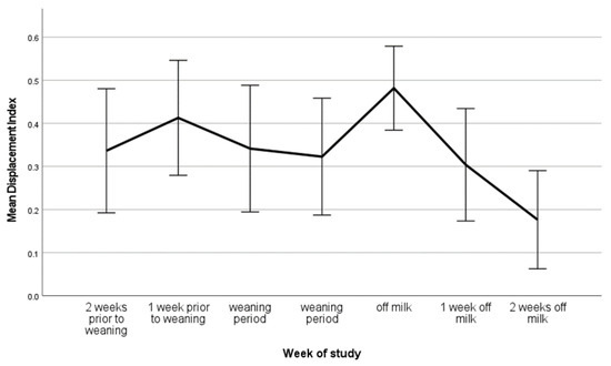Mean displacement index of all calves across the study period (n = 32). Error bars represent the 95% confidence interval.