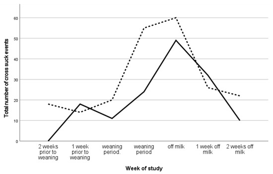 Total number of cross sucking occurrences in each week of the study. The solid line indicates calves in Group 1 (n = 19) and the dotted line indicates calves in Group 2 (n = 13).