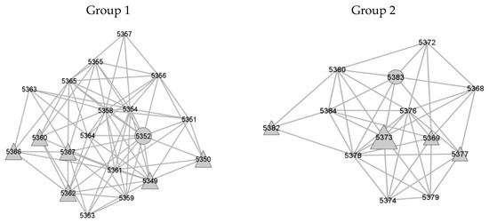 Undirected sociograms showing the preferential interactions between socially dominant calves when cross sucking, with data combined over all seven weeks. Each calf has a unique node to identify it within the sociogram. The Kruskal–Wallis analysis demonstrated that the breed was significantly associated with cross sucking interactions; therefore, these categories are depicted by the shapes of the nodes, but only for calves with a degree centrality (social prominence) above the 95% confidence interval range (circle for beef x, triangle for dairy).
