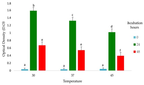 | 24 h | 6.6 × 107 a,+ | 3.3 × 108 a,+ | 5.0 × 109 a,b,+ | 6.0 × 109 a,b,+ | 8.7 × 109 b,+ | 1.9 × 1010 c,+ | 3.7 × 1010 e,+ | 3.5 × 1010 d,e,+ | 2.7 × 108 |