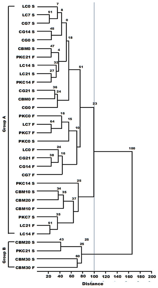 To corroborate our theory, the grouping of the diets via the Tocher optimization method and the dendrogram obtained via the hierarchical grouping between groups method separated the diets with the highest level of lignin into different groups. It is also possible to observe, in the dendrogram, a distance of 60% between the CBM30 S and CBM30 F samples. Therefore, the indigestibility characteristics of the fiber present in the diets were the most responsible in determining the viability of the ruminal inoculum obtained from slaughtered cattle.