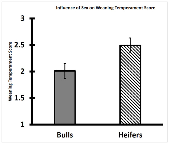 In this study, the heifer calves were more temperamental than the bull calves. The weaning temperament score of heifers was greater (p < 0.01) than that of bulls (Figure 1), as the exit velocity and pen score were greater, respectively, for heifers (2.6 ± 0.1 m/s and 2.4 ± 0.2) than for bulls (2.3 ± 0.1 m/s and 1.7 ± 0.1). Within cohorts of either Bos taurus or Bos indicus cattle, heifers have been reported to be more temperamental and stress-responsive than steers and bulls based on assessments of behavioral and physiological variables [21,24,25,26,27,28].
