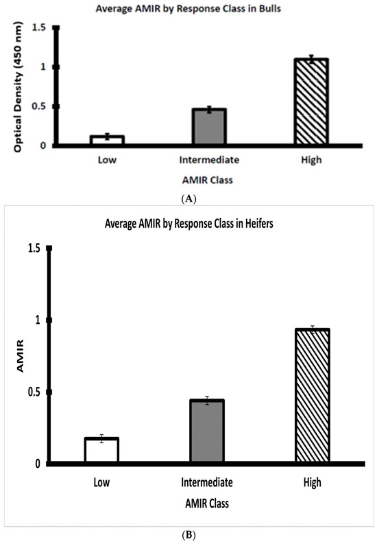 (A) Average AMIR of weaned Brahman bull calves by response class (n = 22 low, 17 intermediate, and 16 high bulls). (B) Average AMIR of weaned Brahman heifer calves by response class (n = 17 low, 26 intermediate, and 14 high heifers).
