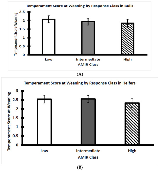 (A) Average temperament score of Brahman bull calves at weaning by AMIR response class (n = 22 low, 17 intermediate, and 16 high bulls; p > 0.05). (B) Average temperament score of Brahman heifer calves at weaning by AMIR response class (n = 17 low, 26 intermediate, and 14 high heifers; p > 0.05).