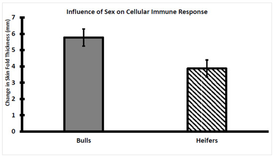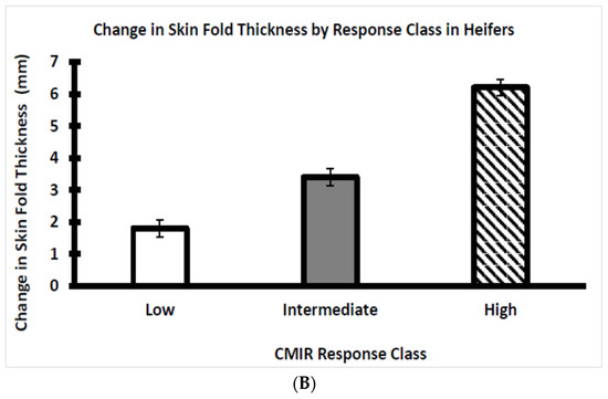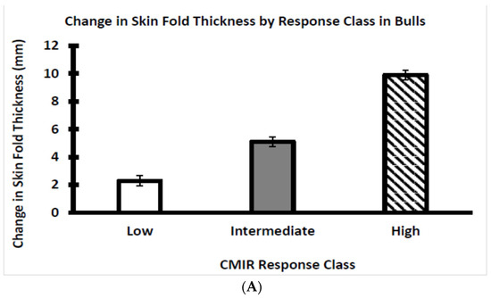 The CMIR did differ by sex classification as the change in skinfold thickness was greater (p < 0.05) in bulls than in heifers (Figure 7). Previously, it was reported that sex classification did not influence CMIR in Holstein bulls and heifers that were 3-to-6 months younger than the Brahman bulls and heifers evaluated as reported herein [30]. Whether these disparate observations are related to breed or age differences remains to be determined.