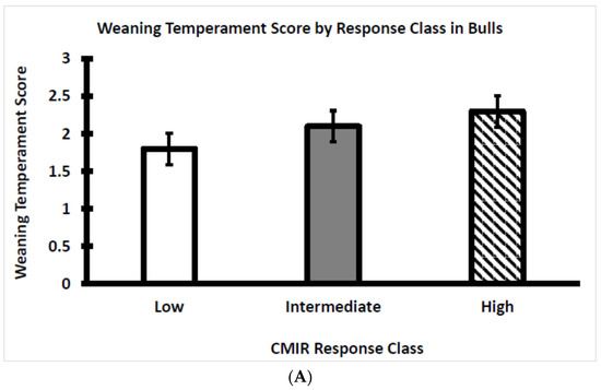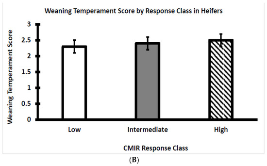 Within each CMIR response class for bulls and heifers, the temperament score at weaning was plotted to visualize potential relationships with skinfold thickness in response to the challenge with Candida albicans. Temperament scores did not differ between the three CMIR response classes with bulls (Figure 6A) or heifers (Figure 6B). Analogous to the situation for AMIR, an assessment of the influence of temperament on CMIR in bulls and heifers has not been reported, although it has been reported that serum cortisol either is not related to CMIR or is positively related to CMIR [4,31], as discussed in a subsequent section of this article.