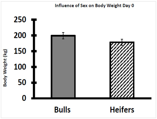 Influence of sex on body weight of weaned Brahman bull and heifer calves on Day 0. Weaned bull calves had greater body weight on Day 0 than the heifer calves (p < 0.01).