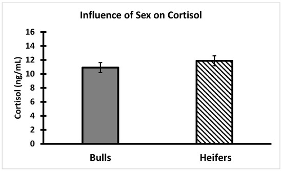 Influence of sex classification on serum cortisol in weaned Brahman calves. Serum cortisol was not different between bull (n = 55) and heifer (n = 57) calves (p > 0.05).