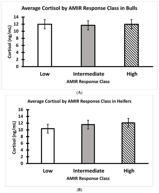 (A) Average serum cortisol of Brahman bull calves at weaning by AMIR response class (n = 22 low, 17 intermediate, and 16 high bulls; p > 0.05). (B) Average serum cortisol of Brahman heifer calves at weaning by AMIR response class (n = 17 low, 26 intermediate, and 14 high heifers; p > 0.05).