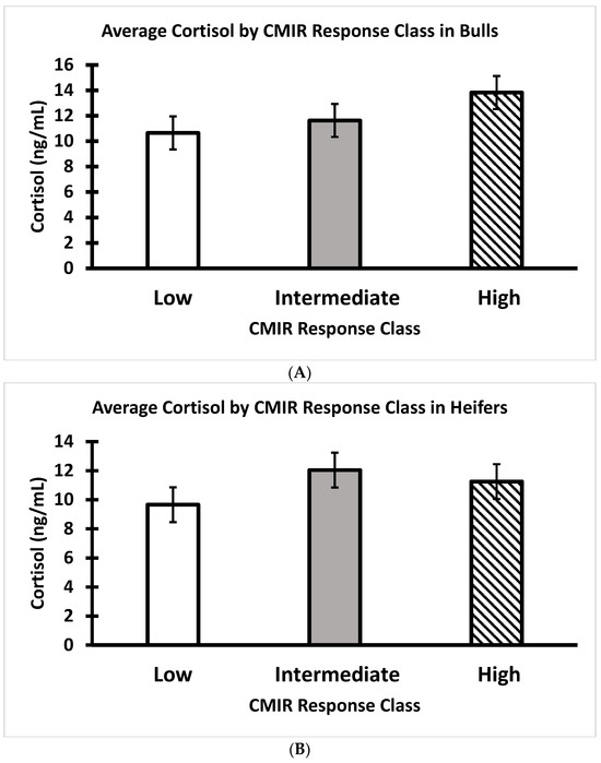 (A) Average serum cortisol of Brahman bull calves at weaning by CMIR response class. (n = 19 low, 19 intermediate, and 17 high bulls; p > 0.05). (B) Average serum cortisol of Brahman heifer calves at weaning by CMIR response class (n = 20 low, 16 intermediate, and 21 high heifers; p > 0.05).