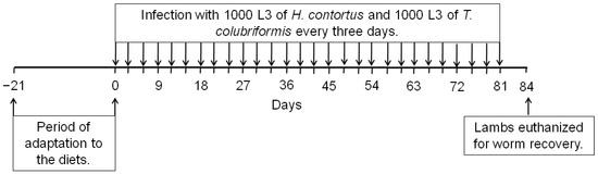 Each lamb assigned to the four diet groups received 1000 L3 of H. contortus and 1000 L3 of T. colubriformis every three days, thus totaling 28,000 L3 of each species over the 12 weeks of the infection period (Figure 1).
