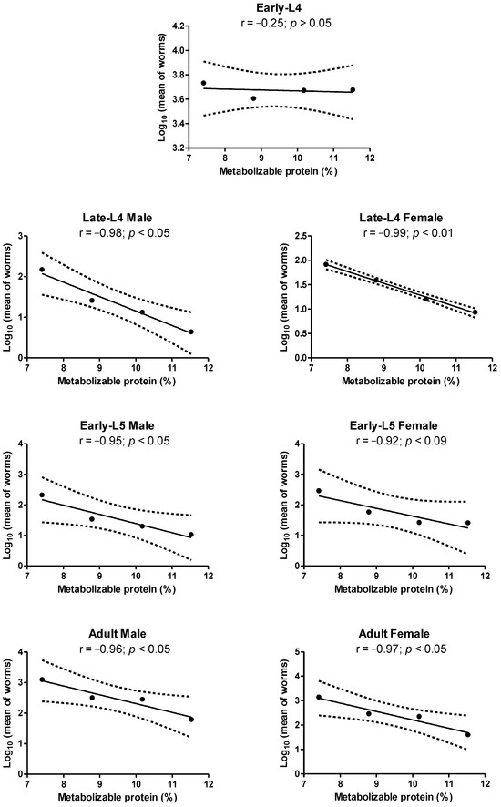 The association between the average number of worms and the chemical composition of the diets (metabolizable protein and metabolizable energy) was evaluated by means of linear regression.
