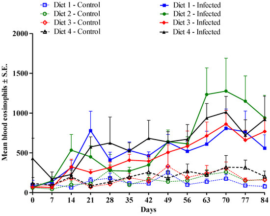 Average numbers of blood eosinophils (cells/µL) of lambs serially infected 28 times, every three days, with 1000 H. contortus and 1000 T. colubriformis larvae. The lambs were fed with Diet 1 (7.4% metabolizable protein (MP) and 1861 kcal/kg metabolizable energy (ME)); Diet 2 (8.8% MP and 2133 kcal/kg ME); Diet 3 (10.2% MP and 2418 kcal/kg ME); or Diet 4 (11.5% MP and 2726 kcal/kg ME). There was a significant infection effect (p < 0.05) from day 14 to day 84.