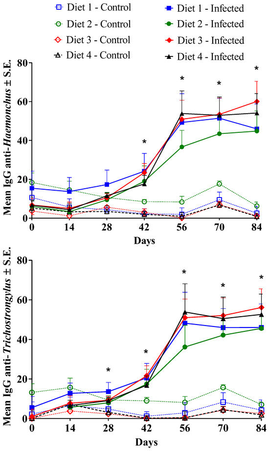 Significant time * infection interactions (p < 0.0001) occurred in relation to IgG values. Sharp increases in the averages for IgG anti-H. contortus and anti-T. colubriformis L3 antigens were observed, with significant infection effects (p < 0.05), starting at days 28 and 42 post-infection, respectively, for T. colubriformis and H. contortus, and continuing until the end of the study (Figure 5). The IgG levels remained high and stable in the last three samplings from the infected animals. No diet effect was recorded (p > 0.05).