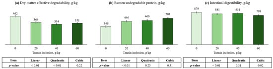 Loregian KE, Pereira DAB, Rigon F, Magnani E, Marcondes MI, Baumel EA, Branco RH, Del Bianco Benedeti P, Paula EM. Effect of Tannin Inclusion on the Enhancement of Rumen Undegradable Protein of Different Protein Sources. Ruminants. 2023; 3(4):413-424. https://doi.org/10.3390/ruminants3040034