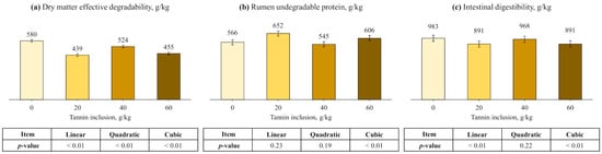 Loregian, K.E.; Pereira, D.A.B.; Rigon, F.; Magnani, E.; Marcondes, M.I.; Baumel, E.A.; Branco, R.H.; Del Bianco Benedeti, P.; Paula, E.M. Effect of Tannin Inclusion on the Enhancement of Rumen Undegradable Protein of Different Protein Sources. Ruminants 2023, 3, 413-424. https://doi.org/10.3390/ruminants3040034