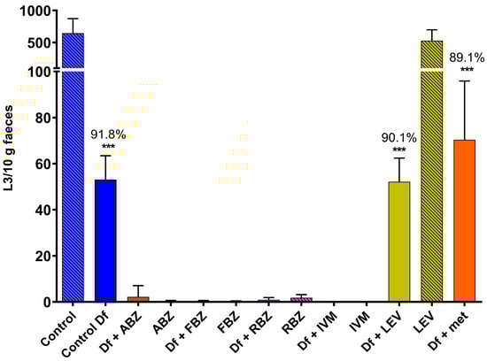 Numbers of L3 recovered from coprocultures containing GIN eggs to which chlamydospores of D. flagrans and/or anthelmintics diluted in methanol had been added. Each bar represents the mean (n = 10) with its standard deviation, expressed as L3/10 g faeces. ***: p < 0.001; Df: D. flagrans; ABZ: albendazole; FBZ: fenbendazole; RBZ: ricobendazole; IVM: ivermectin; LEV: levamisole; met: methanol.