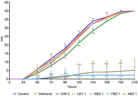 Radial growth of D. flagrans in CMA plates containing anthelmintics diluted in methanol (assay 1). Each point shows the mean (n = 12) and its standard deviation, expressed as mm of mycelial growth every 24 h. *: p < 0.05; **: p < 0.01; ***: p < 0.001. Control: plates with fungus and without anthelmintics; Methanol: plates with fungus and only the diluent; IVM 2: ivermectin 2 ppm; LEV 1: levamisole 1 ppm; RBZ 1: ricobendazole 1 ppm; FBZ 1: fenbendazole 1 ppm; ABZ 1: albendazole 1 ppm.