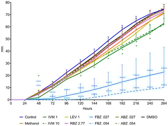 Radial growth of D. flagrans in CMA plates containing anthelmintics diluted in methanol (assay 2). Each point shows the mean (n = 10) and its standard deviation, expressed as mm of mycelial growth every 24 h. *: p < 0.05; **: p < 0.01; ***: p < 0.001; ****: p < 0.0001. Control: plates with fungus and without anthelmintics; Methanol: plates with fungus and only the diluent; IVM 1: ivermectin 1 ppm; IVM 10: ivermectin 10 ppm; LEV 1: levamisole 1 ppm; RBZ 2.77: ricobendazole 2.77 ppm; FBZ0.027: fenbendazole 0.027 ppm; FBZ 0.054: fenbendazole 0.054 ppm; ABZ 0.027: albendazole 0.027 ppm; ABZ 0.054: albendazole 0.054 ppm; DMSO: plates with fungus and dimethylsulfoxide.