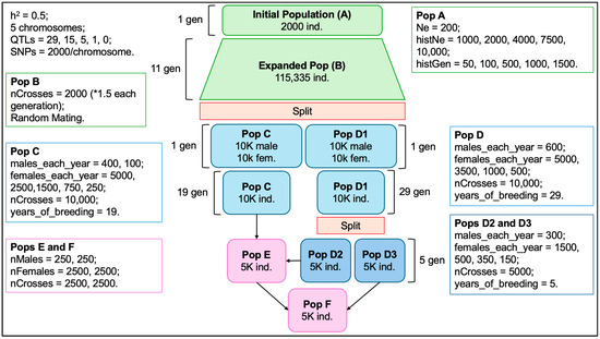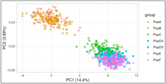 The PCA of the seven simulated populations (Figure 6) exhibited low percentages of variance explained by the first two components, which is not unusual in genomic analyses [33]. Nevertheless, it presented a clear separation between the two initial populations, which were bred at random, and the selected populations, with more distinction between the populations selected for a longer period of time (D2 and D3) and their descendants (E and F) from population C.