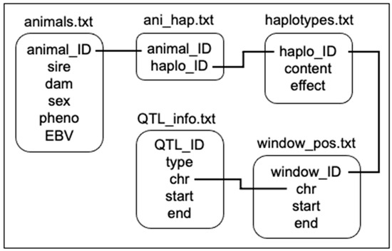 “QTL_info.txt” contains the QTL IDs and their respective type (the affected trait), chromosome, start and end positions. “window_pos.txt” aggregates N markers from the SNP map according to the number of SNPs specified for the window size. For this study, we adopted window sizes of 25 SNPs (2000 SNPs per chromosome/25 = 80 windows in each chromosome). Each window has an ID, and information on their chromosome, start and end positions. “haplotypes.txt” contains all combinations of alleles found in each window of the phased haplotypes. Each haplotype has an ID, content (the allele combinations), and effect (calculated as the sum of the marker effects based on whether or not the allele with the calculated effect is present). “ani_hap.txt” is a matrix of size A×2 x W, where A is the number of animals (times 2 chromosome strands), and W is the number of windows across the genome. The content of the matrix is the haplotype ID for each respective animal strand and window. “animals.txt” contains animal IDs and their respective sire, dam, sex, phenotype, and genetic value.