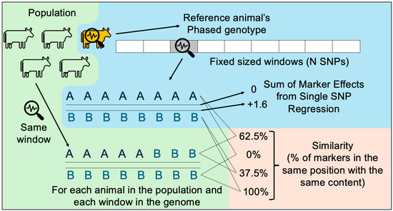 The visualization tool presented herein was built in Python. All the visual and interactive components were added with the Plotly and Dash libraries, and data manipulation was performed using the Pandas library [29]. As illustrated in Figure 3, after loading each of the 5 data sets described in the previous section, one animal is chosen as the “reference individual”, that is, the reference animal to be compared with all other animals. By default, the first animal in the data set is selected, as well as the first strand. Next, for each one of the windows (haplotypes), the similarity between the reference animal and strand is compared against the corresponding window from each individual and strand in the population. The similarity is calculated by dividing the number of alleles that are identical by the total number of alleles in the haplotype.