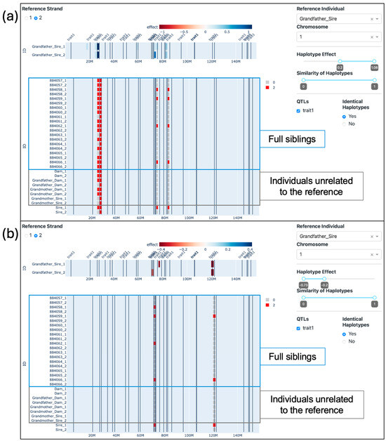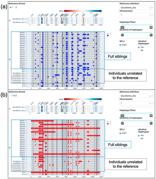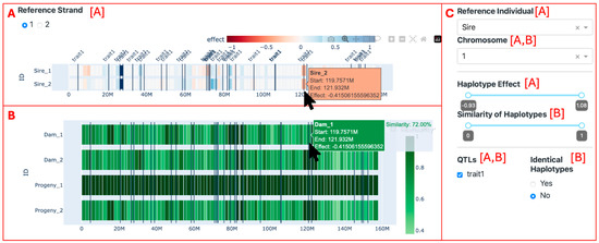 Furthermore, some filters can be applied. In the upper left-hand side of the screen (Figure 4, Section A), it is possible to select the strand from the reference individual (1 for paternal and 2 for maternal) to be used as a reference. On the right-hand side (Figure 4, Section C), it is possible to select the reference animal, the chromosome (only one chromosome can be visualized at a time), a range of haplotype effects, a range of similarity effects, the QTLs seen (by affected trait), and whether identical haplotypes should be highlighted or not. When the haplotype effect filter is applied, the reference individual’s haplotypes that do not pass the criteria are left out of the visualization, leaving a blank space where they should be. This, in turn, causes the haplotypes in the second section to be filtered out as well, reflecting the reference individual’s haplotypes. Conversely, the similarity filter is applied directly to the haplotypes in the second section without affecting the reference individual’s haplotypes. The selected QTLs are seen as vertical lines on the position where the QTLs were reported. When the “Identical Haplotypes” filter is enabled, it transforms the color scale of the haplotypes in the second section to a binary system. In this system, a blue haplotype signifies a perfect match with the reference individual’s paternal haplotype, while a gray haplotype indicates the presence of at least one differing allele. If the second strand of the reference individual is selected, the other animal’s haplotypes are compared to the maternal strand from the reference individual, and the identical haplotypes are colored red.
