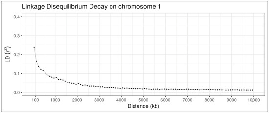 - Bohmanova, J.; Sargolzaei, M.; Schenkel, F.S. Characteristics of Linkage Disequilibrium in North American Holsteins. BMC Genom. 2010, 11, 421. [Google Scholar] [CrossRef]