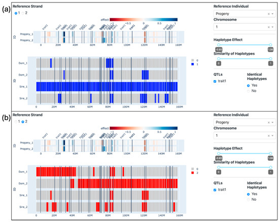 Figure 7 illustrates the interface, where the progeny is chosen as the reference individual, and the option “Identical Haplotypes” is set to “Yes”. We can also visualize the location of the traits (represented as vertical black lines) provided by the simulation software, which can be contrasted with the haplotype effects, represented by the color palette from red to blue on the reference animal’s visualization. The parents’ haplotypes are colored according to whether they are identical or not to the respective haplotypes from the progeny. All the results presented here can also be visualized in the Supplementary Video S1.