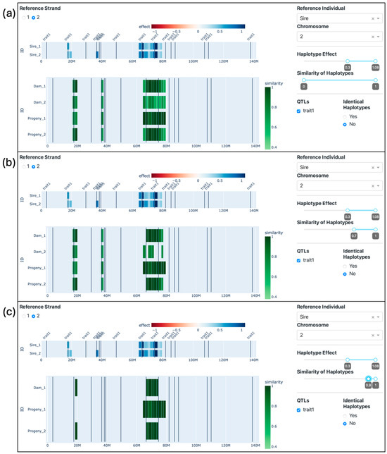 The visualization of haplotypes with great positive effects, where the second strand of the second chromosome of the Sire was selected as a reference. Images show (a) the application of the effect filter > 0.3; (b) the application of the effect filter > 0.3 and the similarity filter > 0.7; and (c) the application of the effect filter > 0.3 and the similarity filter > 0.9.