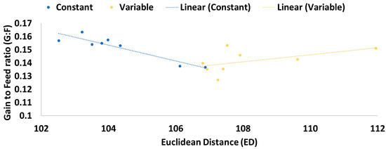 Regression of daily intake variation (ED) determined according to [9] regressed against gain-to-feed ratio (G:F). Treatments included (1) normal inclusion tolerance with a 0.454 kg tolerance for all ingredients (Constant) or (2) variable inclusion tolerance where each ingredient was randomly increased or decreased but the targeted as-fed quantity for the daily delivery was met (variable). Slopes and intercepts differed (p ≤ 0.01). For constant, G:F = −0.0060 (±0.00210)ED + 0.7767 (±0.22269), R2 = 0.86, p = 0.01; for variable, G:F = 0.0027 (±0.00210)ED − 0.1467 (±0.22269), R2 = 0.28, p = 0.17.