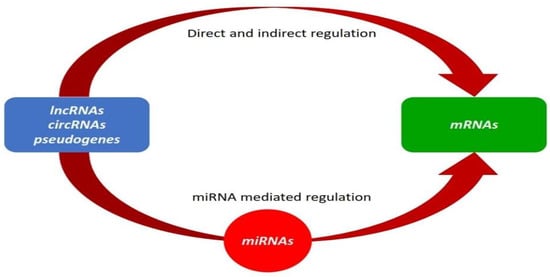 mRNA transcription and post-transcription can be regulated through both direct and indirect mechanisms involving lncRNAs, circRNAs, and pseudogenes. Some modulate transcription rates via nuclear RNA–RNA complexes, whereas others affect mRNA stability in the cytoplasm. Additionally, the ceRNA mechanism offers parallel and complementary control through protein–coding and non-coding RNAs. Rather than direct interactions, ceRNA is mediated by miRNA-binding competition [].