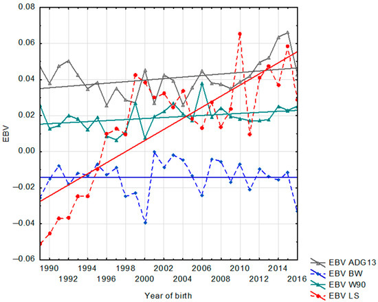 Finally, the standardized average trend in EBVs for the analyzed traits over time is shown in Figure 1. The estimates of slopes were: 0.0031 for LS, 0.0006 for BW, 0.0003 for W90, and 0.0004 for ADG13 in standard deviations of traits. A favorable positive increase in LS was found over time (0.053 lambs in 28 years). For BW, W90, and ADG13, the tendency did not present a clear pattern, and a slight increase was observed (0.0092 kg, 0.0325 kg, and 0.609 g for BW, W90, and ADG13, respectively, in 28 years).