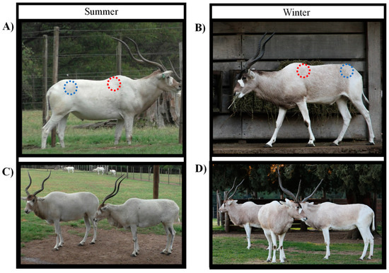 Images of male (A,B) and female (C,D) Addax nasomaculatus in the summer (A,C) and winter (B,D) seasons housed at the Parque Lecocq zoo, Montevideo, Uruguay. Red dotted circles indicate the shoulder region and blue dotted circles indicate the rump region from which hair samples were obtained.