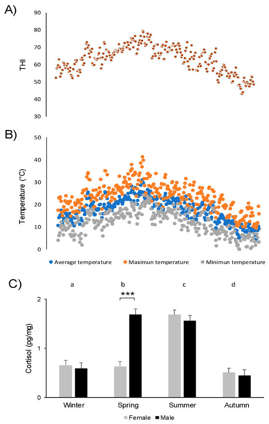 Changes in THI (temperature and humidity index) (A), maximum, average, and minimum temperature (B), and hair cortisol concentration (mean ± sem) (C) in female and male Addax nasomaculatus according to season of the year. Different subscript letters denote statistical differences between seasons (p < 0.05). Asterisks represent significant differences (p < 0.0001) between sexes within season.