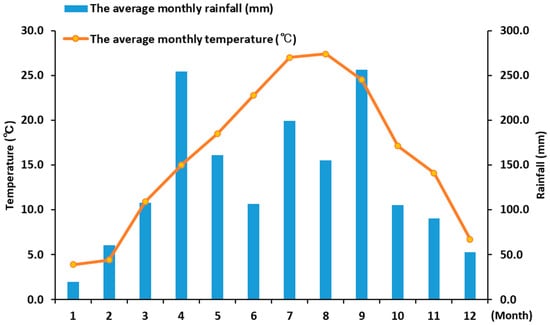 The temperature and precipitation for January to December 2022 in the subject area. The line graph shows the average monthly temperature, and the bar graph shows the average monthly rainfall.
