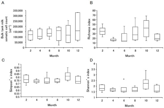 The percentage of Pseudomonas spp. in the bulk milk of the farmers included in this study was small and did not fluctuate throughout the year. Since Davide et al. [] pointed to the inadequate cleaning of milking equipment as the cause of high amounts of Pseudomonas spp. in bulk milk, it was thought that the cleaning of milking equipment was sufficient for the farmers in the study. On the other hand, Streptococcus spp. was found in several samples, and especially in those with BTSSC above 300,000/mL (December, Farm A and Farm E), at a higher rate (19.49%, 0.50%) than in the other samples (0.12–0.21%). Previous studies have attributed the increase in Streptococcus spp. to the contamination of milk from cows with clinical mastitis []. Although the cows in this study were clinically observed prior to milking and screened for mastitis milk by pre-milking to ensure that they did not have clinical-type mastitis before milking, the possibility could not be ruled out that milk abnormal enough to affect BTMM was introduced.
