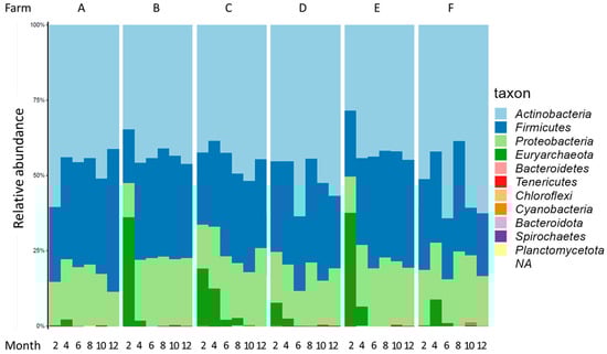 A farmer-to-farmer comparison of the BTMM composition on the target farms is shown in Figure 3. The composition ratio of each farm was mainly composed of the phylum Actinobacteria, phylum Firmicutes, and phylum Proteobacteria, and there were no significant differences among farmers, although farmers B and E had a higher proportion of Euryarchaeota in February.