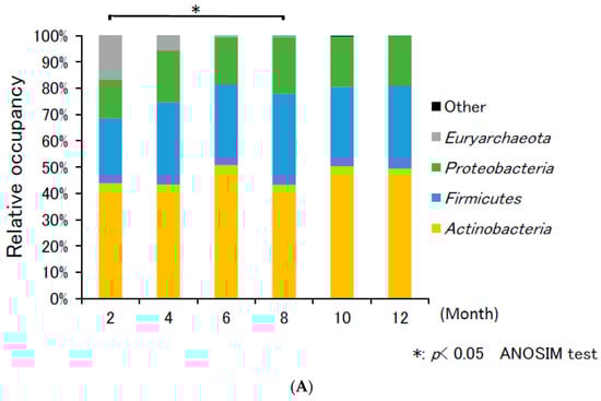 (A) Stacked bar graph showing annual changes in bulk tank milk microbiota (BTMM) composition, and (B) principal coordinate analysis based on Bray–Curtis distance. Asterisks indicate significant differences estimated by the analysis of similarities (ANOSIM) test with Bonferroni correction. The major phyla were Actinobacteria, Firmicutes, and Proteobacteria, in descending order of abundance, and the ANOSIM test showed a significant difference in the composition of the microbiota in February and August.