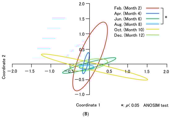 Annual changes in BTSCC and the alpha-diversity indexes (Richness, Simpson’s, and Shannon’s indexes) of the BTMM across the targeted farms were analyzed by the Friedman test, a nonparametric test. This analysis was performed using EZR plugin (ver. 1.61; Saitama Medical Center, Jichi Medical University) for the R statistical package (The R Foundation for Statistical Computing, Vienna, Austria) []. p values less than 0.05 were considered to indicate statistically significant differences. The composition of BTMM was compared monthly using non-parametric tests for similarity analysis (ANOSIM), which used the Bray–Curtis distance scale to measure compositional differences. p values less than 0.05 were considered to indicate statistically significant differences. This analysis was performed using the PAST 4.13 version software package []. Linear Discriminant Analysis Effect Size (LEfSe) analysis via the online Galaxy interface was performed to identify the specific bacterial species that showed significant differences in abundance in each month, as indicated by the ANOSIM test results [].